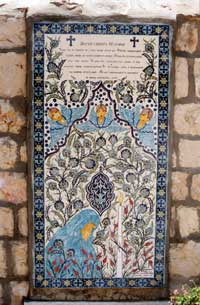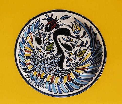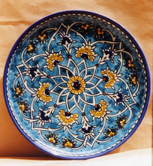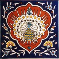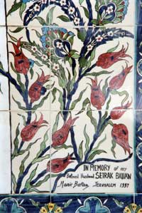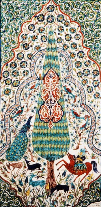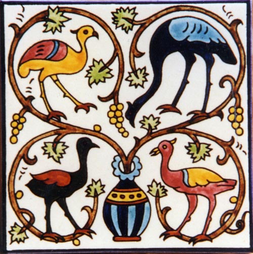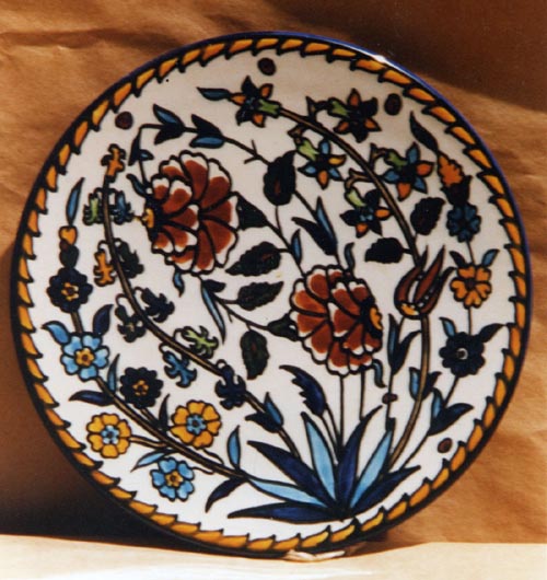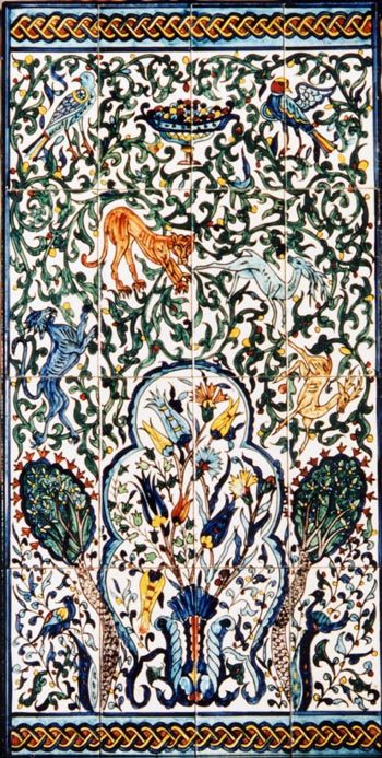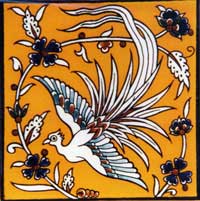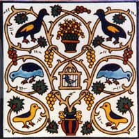 The Artistic Language of Marie Balian In Marie Balian's early works, it is already possible to detect efforts to draw gazelles and birds in motion. In contrast with the static images of the Karakashian-Balian workshop, Marie Balian presents her animals in motion, with their heads turned, running and galloping. Her birds also move, lifting and bending their heads. Not only do the images themselves move; Marie has also begun to develop a personal handwriting, characterized by a moving, wavy, and feminine line. In addition, she has a well-shaped vocabulary of images whose meanings must be understood. Her composition is ostensibly symmetrical, but in actuality, simultaneous narratives unfold on each side and at the top and bottom of the drawing. The changes are of primary importance. The world that Marie depicts is no longer symmetrical, but rather has taken into consideration an infinite variety of parallel events. Her affinity for conflict, for the equivocal and for distance, echoes in her fantastic and legendary compositions of objects. Nonetheless, her yearning and desire is to intuitively create a world that is legendary in its beauty. The world created by Marie Balian's art is one of sensual beauty built through the harmony among the forms and the splendor of the light shining on the glazed tile. Beauty as a sensual and idyllic quality is alien and foreign to twentieth century Western art, which is concerned primarily with the individual and radical expression, with the debating of conventions and, primarily, with the conscious deconstruction of traditional representations of beauty. The art of Marie Balian in Jerusalem sought to create a beauty that would reflect divine acts in material objects. Thus, her description of extensive and dazzling vegetation serves as a Fata Morgana, a mirage in miniature. The objects themselves also function on several levels: on the sensual level of touch, on the aesthetic level, as a vision of paradise, and on the symbolic level, as a promise. In a country, where the landscape is barren, arid, and desolate, dressed in concrete and cement, the ceramic art of Marie Balian enables us to touch a material object that functions as a garden in the desert (figs. 14-18). The Art of Stephan Karakashian In 1964 Stephan Karakashian and his brother Berj left the workshop they shared with Setrak and Marie Balian and set up their own workshop in the Via Dolorosa, while the Balian family continued to live and work in the old workshop at 14, Nablus Street. Through almost the entire forty years of his creative work, Stephan has preserved central designs passed on to him by his father and from the common workshop. He has focused on the precise painting of those designs, but produced them in a changing spectrum of colors and on tiles and vessels in a variety of forms. I believe that in addition to the ongoing and intimate dialogue between Stephan Karakashian and the common workshop, in which his father was the painter, he also found a source of inspiration in one particular group of Iznik's ceramic artists. This group, dated by Raby to the mid sixteenth century,9 developed the motif of a flowering cherry tree, its branches spreading across the whole plate. The blossoms are drawn with simplicity in a variety of colors. A similar group from the same period also produced birds (generally one bird in a thicket of leaves). Karakashian journeyed to Istanbul in the 1970s, and his repeated encounters with the ceramic paintings there most certainly reinforced his affinity. The diligent study of the Iznik lexicon of forms by Stephan, is expressed in frontal depictions of garlands of flowers, in the main shown inside small jugs placed at the bottom of the picture. The flowers are smaller and a multitude of leaves appear on the branches. In addition, the motif of bunches of grapes, so typical to a certain group of Iznik's ceramic artists, is also manifested by Stephan, albeit in his own independent style. The Most Prominent Designs of the Karakashian Workshop The focal designs that appeared in work produced by the Karakashian workshop were those of arabesques; birds nesting in the thicket; flowers and vine tendrils (figs.19 and 20); fish, flowers; orderly branches of grapes; a fawn with upward gaze; and biblical scenes, most of which were freely copied from eighteenth century tiles in the Armenian church of St. James. Birds In all the examples of birds depicted by Stephan Karakashian the birds dominate the scene. Some of Karakashian's birds can be compared to the traditional Iznik designs of the sixteenth century, but they became the central motif of the composition. Karakashian's portrayal of their spread feathers endows them with central and independent importance as a meaningful image. Main Bird Designs: 1. A crane flying with fantail, neck and beak stretched upward and orange flowers around its neck. Appearing to move as the plate is rotated. The crane image appears on a hexagonal tile created by the common workshop. It is based on a drawing on an ancient bowl, discovered in Fustat (Old Cairo) in Egypt and now in the Islamic Museum of Cairo. 2. A fabulous white bird, strutting across a landscape of tendrils. Its fantail is erect, composed of circles borne on stalks. It faces a branch with small leaves, drawn in a half-circle. 3. A long-tailed bird of paradise, the tail in three sections. The neck is curved like that of a swan. This bird is painted in various colours but always against a white background, with the tree on which it perches designed as colourful tendrils, mostly comprising upper and lower twines with flowers among them. 4. A pair of peacocks with necks entwined and two enormous spread tails, portrayed as an autonomous element in the form of huge leaves, containing colourful circles. This design can be compared with the Iznik design in which two birds stretch out their beaks to one another. 5. Spread-tailed peacock, displayed frontally. The fantail serves as a medalli