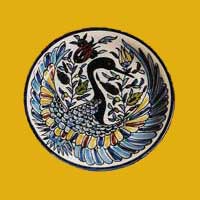 7. Two tiny long-tailed birds on two branches of a flowering tree with blue and yellow blossoms. The tails are depicted in bold, almost graphic, lines. 8. A single bird on a flowering branch. The tree branches are shown frontally and rise upwards like a candelabra. The bird's tail and plumage are detailed, concrete and in myriad colours. 9. A bird in flight with a fantastic tail, its two long trains sweeping out into the pictorial space from within the mass of feathers. The tail and feathers also constitute a charged image, recalling a wild plant, flames or emerging spring's streams (fig.24). 10. Fish and birds together. A unique combination by Stephan Karakashian on one plate: creatures of the skies and the earth united in one space. In the centre of the plate, on a blue background, are three white fishes contained in a circular frieze. The fish appear to be flying in their movement. Encircling the plate are small birds with spread wings, their bodies resembling those of the fish. Karakashian's birds are an expression of his style: strong outlines, determined and bold, offering an intensive and powerful expression. The colors are local and heavily layered. One prominently colorful group is that of the above-mentioned bird designs in white against a blue, pale blue or even orange or green background. White bird images, also with the addition of several secondary colors on tail and wings, convey a sense of mystery and legend. Karakashian turn the birds into a static element, endowing his painting with a characteristic lack of movement. Even the crane flying with outspread wings, painted in white against a blue background, is depicted as an emblem of 'flying crane' and not as a celebration in the sky. These same birds receive additional meaning when appearing as colorful birds against a white background. This change in the artist's palette enables a transition from the mystery of white birds to a depiction of nature in spring. Karakashian's bird images are isolated and stylized. The components endow them with a symbolic character. The fixed, static and isolated forms draw the observer's curiosity and demand an inquiry into their significance. To characterize Stephan Karakashian's personal hand writing one should compare his works with those of his father in the common workshop. (Karakashian, by the way, in an interview in March 2000, emphasized that he learned his art from always having his table adjacent to that of his father 10). To conclude, in his work Karakashian tends to select individual motifs and turn them into the main theme of the new composition, thereby enhancing their importance. Artist and Workshop - Consciousness and Identity The parallel work of the Armenian ceramic painters, Stephan Karakashian and Marie Balian, each with their own workshop artists, enables a singular examination of the similarities and differences in the creative paths of the two artists: one can follow their approach to identical designs that each had received when the first generation common workshop separated; the ways in which each of them preserved traditional designs; the methods of introducing changes and developments; their paintings and artistic concepts, and the link between the two artists and the paintings being carried out in their workshop. Studies of the work of artists in the Middle Ages, and even during the Renaissance, do not always provide sufficient information on the designs available to the workshops, on the approach of the workshop's master to the various levels of workers, or their attitude to the art of the master. The ability to follow the works of Marie Balian and Stephan Karakashian throws light on the work methods of earlier periods of artistic workshops. First and foremost one can see how a particular design was preserved over the generations, and a design that we recognize from the common workshop of the 1930s, still exists in the present workshops of 2001. As noted, the designs were developed or preserved in different ways. Furthermore, one can see new connections of old designs, also familiar from the common Balian-Karakashian workshop. One can easily identify the master artist's style. The works of Marie Balian, for example, are prominent in their linear movement, combination of colors, complex composition of several planes and figures. Her vessels have several sides: face, back and sides, and her plates have two sides: top and bottom. In contrast, Stephan Karakashian's works usually select only one major image, spread over its entire face of the utensil, generally on the lower, emphasized part of the picture. In addition, his works are characterized by few images, symmetrically arranged over the area. Regarding this latter aspect, we shall examine the design of the spread-winged phoenix, created by Megerdish Karakashian in the common workshop. Stephan Karakashian too, as well as Marie Balian, each returned to this design according to their own perceptions. A comparison between the two is highly revealing. Stephan's phoenix (fig.25), to which he returned many times on both plate and tile paintings, shows a long white neck, very sharp beak and outspread wings across the plate or tile, matching the frame design: the round frame of a plate or the square one of a tile. The wing feathers are colored schematically in orange, blue, white and pale blue. The plumage is in pale blue and black. The bird's long neck resembles that of a fabulous swan, thrusting out from its body, in effect creating geometrical shapes that match the plate and its directions. Marie Balian's phoenix (fig.26) - a design seldom repeated - is painted on a plate with a white background. The bird is smaller than the surface of the plate and each side features bunches of colorful flowers. The bird's wings are not carefully colored; quite the opposite: the black outlines of the frame are created in swift, impressionistic brush strokes. Balian's aim is to depict the bird as flying between the colorful flowers, 