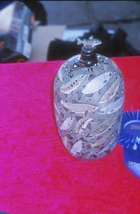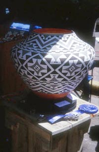 Visitors were encouraged to touch the goods, and the quality of the pots under my fingers varied. Some were exquisitely finished, with detailed designs and thin (but not too thin) walls. Others were not so well made, with patchy paint work, walls of varying thickness and, in a few cases, powdery inner surfaces. Many pots were displayed with a photograph album alongside. This always showed the potter in the act of pit or bon-firing, and was intended as proof of authenticity. Overt technicality characterised the prize-winning pots, which had been awarded satin rosettes, displayed on the tables beside them. If a potter had featured in a publication, then that too went on the table. The design content overall was broadly traditional, the prices comparatively expensive, especially if the maker was (as many were) from one of the better-known pueblo potting families.43 There was a category for innovation, but on the whole what I would call innovatory versions of pueblo pottery were few and far between. There was little opportunity to question individual potters at any length - they were so busy selling their wares. I eavesdropped as much as possible and took photographs. (See illustrations). There are parallels between the web sites I visited and the Indian Market. In each case pueblo pottery is juxtaposed with an array of different artefacts; one either clicks on a button, or moves to another stall. It was exciting to recognise pots from past encounters on the Internet. At www.nativepots.com for example, there are images of pots by Jody and Susan Folwell. They measure up well to the real thing. Both women work comparatively large, as pueblo pottery goes, and in this context size is significant. Since images are inevitably tailored to screen size - whatever that is - the visual environment of the web has a normalising effect. Indeed, in some cases the on-screen version exceeds the real object, or rather, one's perception of it is both standardised and enhanced. Annie Baca's pots fill the screen, but they are actually small, and the difference between their real and virtual presence is significant. The same is true of Dolores Curran's work. Compare the web site images (www.nativepots.com/scpottery.html) with my photographs taken at the Indian Market. (See illustrations).