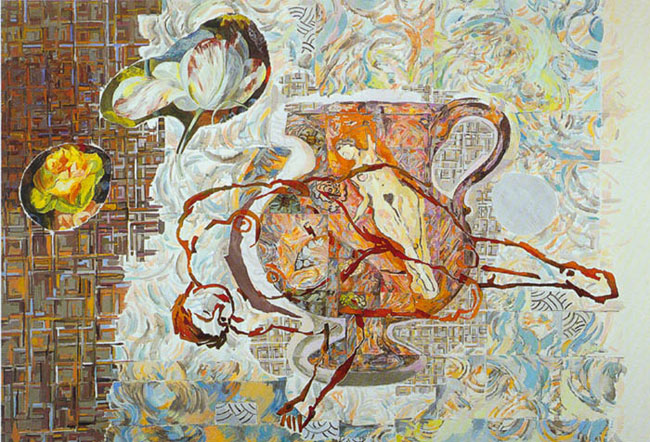 My sleeping female figure in this painting (fig. 1) is depicted in a simplified manner, as a linear motif or form, invaded by pattern and intertwined with fragmented elements. She suggests a strong presence in the sense that she is locked into the physicality of the paint as well as a sense of fragility and fracture in that the image, constructed from parts, may ‘unravel’ at any moment; she may fragment. My figure engages with the world from the inside out. The issue for me is not how she is seen by the viewer but how she experiences the world beyond her own physicality.