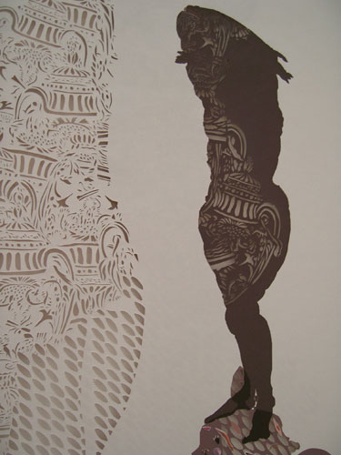 This collage on paper (fig. 4) is 100 cm high and the image is made up of a Sèvres vase shape and patterns, along with a female figure form poised on the top of the vase, removing her vest. She is isolated and self-contained, suspended in a slightly precarious position on the top of a vase. The process to begin this work, which is one of a large series of related collages, is by working directly with drawing and digital photography, both at the Wallace Collection and using myself as model, to acquire a large ‘bank’ of visual information (fig. 5). This bank of information is stored both in drawing books and on the computer. I reference it and use it both through the computer and in the studio in order to form compositions and to construct the images. Initially, I ‘cut’ and ‘paste’ the fragments digitally; through the computer the style of the elements, for example the vase or the figure, is simplified and changed, pattern variations are introduced, the colour, scale, and relationship of the elements are resolved (fig. 6). The digital image is then printed onto paper using a large format inkjet printer. It is then further developed in the studio by manual cut and paste using scissors and glue; many of the physically cut pieces are re-stuck onto the print or on the underside of the paper. This process creates an actual laying onto the surface and a tactile, embroidery, or lace-like surface evolves (fig. 7).