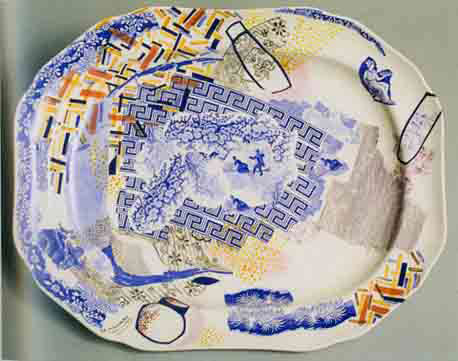 In my view, a nineteenth-century notion also prevailed at the Slade – the male artist was associated with anti-domesticity, anti-social behaviour, a Bohemian heroism and intellectuality, whereas the women were, and I quote from Griselda Pollack and Rozsika Parker, ‘beautifiers, civilizers, orderers in the face of social mobility and economic instability of a chaotic and threatening world’. To generalize, women painted flowers and still life, men painted history scenes and monumental works. Many feminist women artists who were with me at the Slade made their voices heard working in less traditionally based media such as video and installation. I felt strongly at the time, and still do, and perhaps now in the twenty-first century it is a more commonly held view, that it is possible to make serious and profound work in traditionally based media, such as painting, which address issues around domesticity, a sense of order, and a private female space. All that is considered feminine – the decorative, delicate, sensitive – can be a vital and powerful force. I am fascinated by the view that ‘women are orderers’. We can order and therefore disorder. The process of collage is the construction of parts or fragmented elements to make a whole. It is a simple but empowering process. The destruction of elements and visual images which already contain meanings is inevitable and a crucial part in the way that I form my own imagery. I seek to present my own sense of order which, by being held by the parts, inevitably has the potential to break up. In 1998 I was invited by the managing director of the renowned Staffordshire ceramic factory, Spode, to work on the factory floor as an artist, making individual designs onto the existing Spode ceramic ware (fig. 8). This was my first experience of working onto ceramic and it was the beginning of a fruitful informal relationship which continued over a period of six years. I was in the privileged position of having access both to the skills within the factory as well as to their coveted archive of more than twenty thousand copper engraved plates dating back two hundred years. These engravings are printed onto a tissue paper with ceramic ink and are then transferred, while wet, onto the ceramic ware at the biscuit stage, processed, and fired. The engravings range from sheet patterns or chintz to the famous pastoral scenes such as ‘Italian Blue’, of which figure 9 is an example.