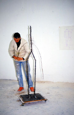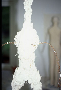 Haring starts making her figure with an iron structure characterized by her as a rudiment of the figure (fig. 13). The iron structure depicts the bare essentials of the human form. She uses this figurative fragment as her starting point and gradually forms the volume of the figure, applying small portions of plaster onto the iron frame (fig. 14). Listening to her one gains the impression that the artist perceives the object as a feeling being and its growing is physically interlinked with her. For the understanding of her corporeal interlinking with this figurative fragment one has to bear in mind that structurally the iron frame is very similar to the human skeleton, which is the most fundamental structure of the human figure. Haring senses the first application of plaster as the most crucial and tense phase of the work as in this stage the skeletal frame appears to be most responsive to the gravity of the material (fig. 15). Thereby the frame seems to behave similarly to the human vertebrae and evokes bodily feelings, as it behaves like a spinal axis, interacting with the distribution of the muscles or here the plaster.1 This bodily association with the iron frame means that the artist sees a behavioural pattern in the frame which correlates to her own body and appears to be a vital aspect for her feeling of the figure growing and for her aesthetic judgement. In keeping with the bodily association of the iron frame one could interpret the liquid plaster, flowing down, with images of blood flow and when the plaster cures it appears to assume the texture of fleshy matter. Therefore one could read her method of adding plaster to the iron frame as filling it with ‘flesh’. This would explain her strong sensation of the iron frame as the inner core from which the material manifestation of the figure commences by filling a space with plaster. Considering that the skeleton is a fundamental structure for the body, Haring’s process appears to address metaphorically the beginning of the body. Additionally, a further aspect of fragmentation can be observed between the underlying presence of the figure suggested through the iron frame and its becoming, expressed in the progressive adding of plaster and the developing volume of the figure.