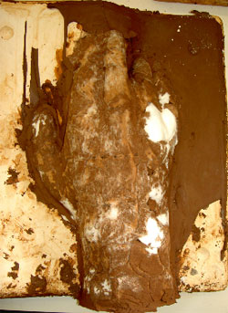 During the firing the deformation of the glove becomes more explicit with increasing temperature. The higher the temperature, the more of exterior plaster (composite) coating cracks and melts away, exposing large parts of the inner hand (figs. 20 & 23). It generates the impression that the ultimate fragmentation and wounding occurs within the kiln. Referring to Scarry’s imagery of the tool as a weapon, the kiln is not just a weapon but appears to act like a knife, peeling and dissolving the exterior glove. The layers of glove and hand are stripped and burnt away until only a skeleton of a hand remains (fig. 24). The heat reveals the layers of combustibles which were saturated with clay slip, and the ones which were not and burnt out completely. What emerges appears to be the anatomy of the becoming of the expression. Although the kiln fuses the material, simultaneously it takes apart what has been assembled, reinforcing the principle of doing and undoing as represented by Scarry. This means that concepts of making and unmaking converge within the kiln. The sensation of pain, which is characterized by Scarry as a sign of the materialization of man, becomes a major means of forming the inner hand. The completely bared hand (fig. 24) does not signify a rudimentary building block like the skeleton for the human body, but reveals an articulation of pain resulting from a series of deformations (fig. 25).