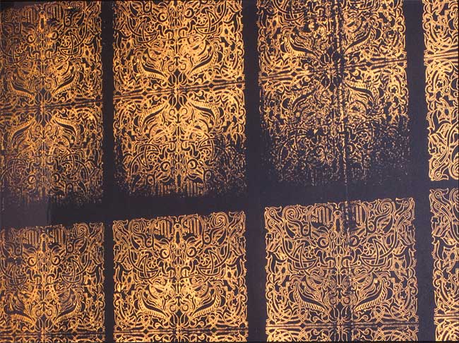 The next image is a simplified line drawing from a complex architectural building in Morocco (Image 10) that leads to a silkscreen that became a drawing/wallpaper that covered the surfaces of two walls, one black on yellow and the other yellow on black. This piece was made and installed in 2003. The original drawing was scanned and made into a silk screen. The process of screening allows for multiple images to be generated quickly. (Image 11) On the wall, the image is manually screened one block at a time. The printing process is the place where variation occurs. Each screened image records a different amount of color and texture from the original drawing. This created a repeated pattern field that covered two walls of a small dark room. At first, the pattern seems uniform, but after a few moments, the viewer realized that each printed block recorded a distinct visual motif. The color contrast between the black and the yellow is stark, and created an optical illusion of movement in the room that was not lit except for the light coming through the door. The process of silk screening in my work would later move from the wall to the pot.