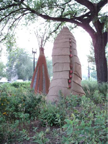 Using straw and mud prepared as for traditional house building she organised the construction of five sculptures 7- 16 feet tall representing a family of characters – one in the shape of a tipi others more igloo like. The constructions were based on traditional house building methods in the Pueblos and were intended to decay gradually and ‘go back to the earth’. Incorporating video recording and participant involvement, people were interviewed as the pieces were being constructed. Entitled ‘Always Becoming’ she wanted the work to convey ‘the unique relationship indigenous peoples established with their environment’.12 Thus she used her medium of clay/earth and other natural materials to assert a Pueblo presence and Native American values in the heart of Washington. (Fig. 9)