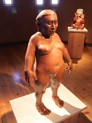 In ‘Pueblo Figurines for Sale’ (1999) (Fig. 10) a powerful naked female figure holds out a small black figurine, finished with the high burnish typical of Santa Clara Pueblo. More black figures lie in front of the sculpture which seems to glare out at the viewer with an expression of distrust. Like an ancient sibyl or prophetess this weighty figure is a comment on the position of the Pueblo potter and, by extension, Swentzell’s own position as an artist in the marketplace. Writing about this work she asks,