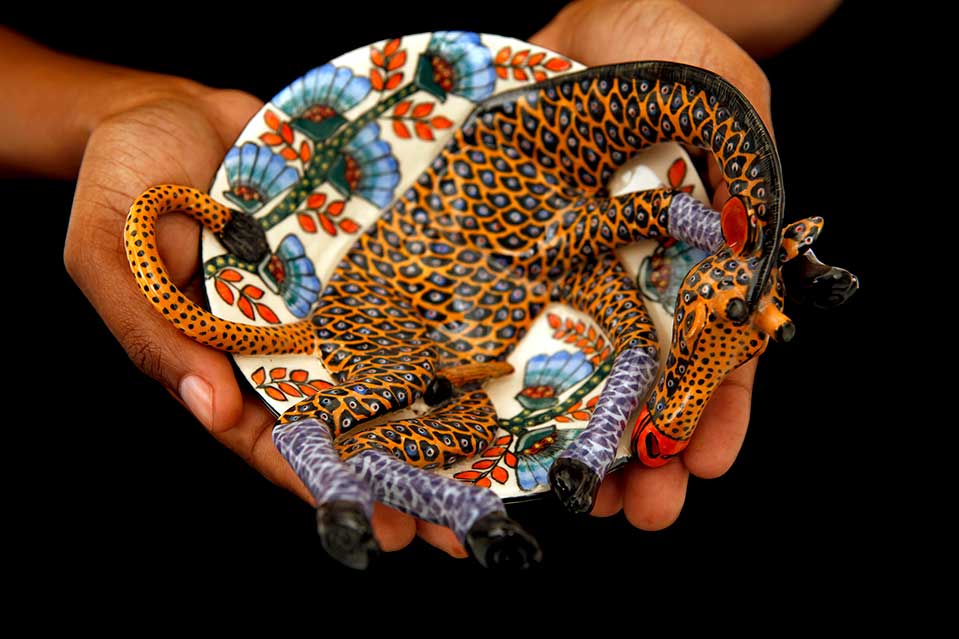 Fig 17. Giraffe-shaped bowl, sculpted by Somandla Ntshalintshali and painted by Punch Shabalala, Ardmore, KwaZulu-Natal, 2006. Held by Nomthandazo Mkonjiswa. Photograph by Carina Beyer, Iziko Museums of South Africa.