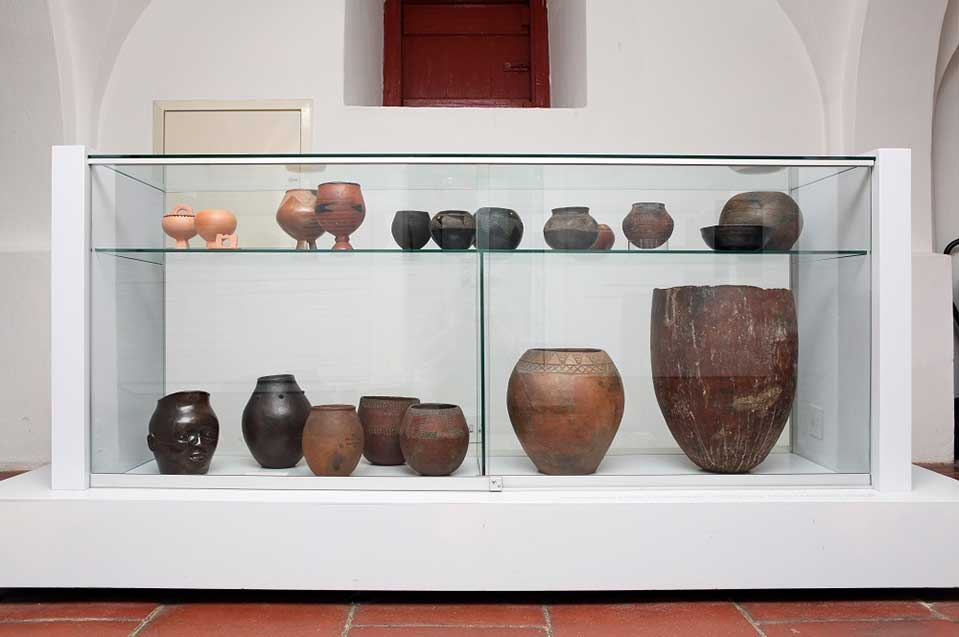 Fired was installed at the Castle within an evocative space with arched ceilings and columns, and presented in two large elongated chambers (Fig.1). Created in the late seventeenth century, the space was originally used as a Granary during the time of Dutch East India Company rule at the Cape.2 The design of the exhibition was approached with sensitivity towards the heritage aspects of the space and respect for the unique architectural features of the locale. Although it is one of the Castle’s most beautiful venues, the Granary has relatively limited floor space due to the many columns. This posed a challenge regarding the positioning of glass display cabinets required to exhibit ceramics safely. The exhibition designer worked sensitively around these limitations and created a visual balance between the display furniture and the architectural elements, positioning the display cases centrally, rather than placing them along the outer walls. Furthermore, the designer chose not to hide special architectural features such as old niches, staircases and doors, but opted to present the exhibition against the historical and textured backdrop provided by the original fabric of the building.3